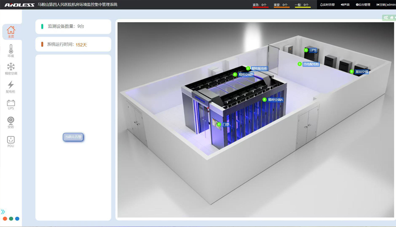 動環監控係統:本次主要是(shì)針對UPS、溫濕度、精密空調、漏水、煙感等設備進行監控(kòng)項。當係統檢測到的數據(jù)超(chāo)過用戶(hù)設定的上限(xiàn)或是下限時,可根據用戶需求短信、語音報警(jǐng)、聲光報警(jǐng)、WEB彈窗、郵箱等多種方式發送告警信息通知相關人員,及(jí)時處理異常問題(tí)