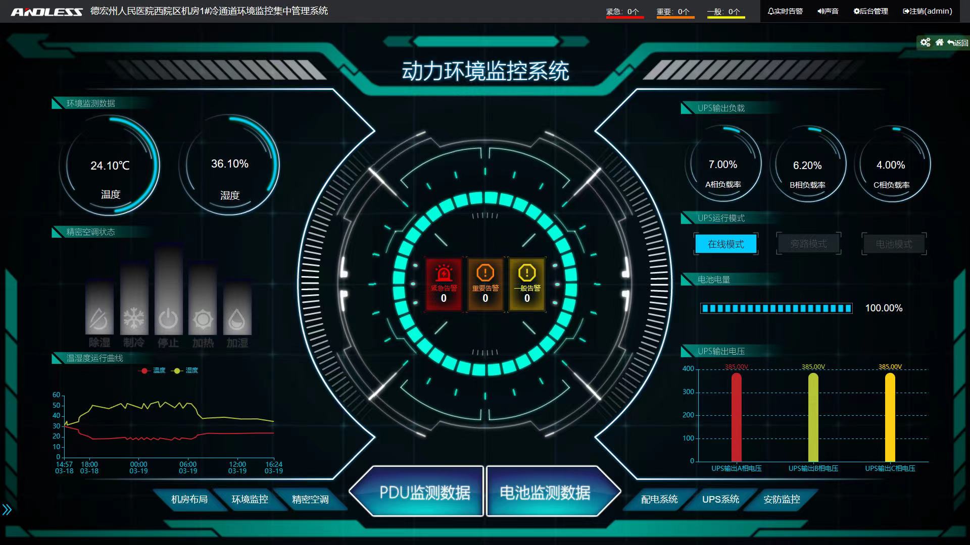 安(ān)德力士公司為德宏州醫院信息化建設提供支持,為貴院數據(jù)機房建設2套GLM微模塊機(jī)房係統,包含UPS不間斷電源係統、精密空調係統、環境檢測係統、配電係統、PDU監測係統(tǒng)以及(jí)一套(tào)環境監控集(jí)中管理係(xì)統,設備現已(yǐ)安裝調試完成。貴院機房建設(shè)使(shǐ)用4套UPS電源係統,2套UPS電源為(wéi)數據中心機房IT設備提供後備電源保(bǎo)障,2套為醫院大樓弱電井係統提供後備保障。機房使用9台行間空調,2台房間級基(jī)站空調,11台(tái)空調為機(jī)房提供一個(gè)恒溫恒濕的良好運行環境。